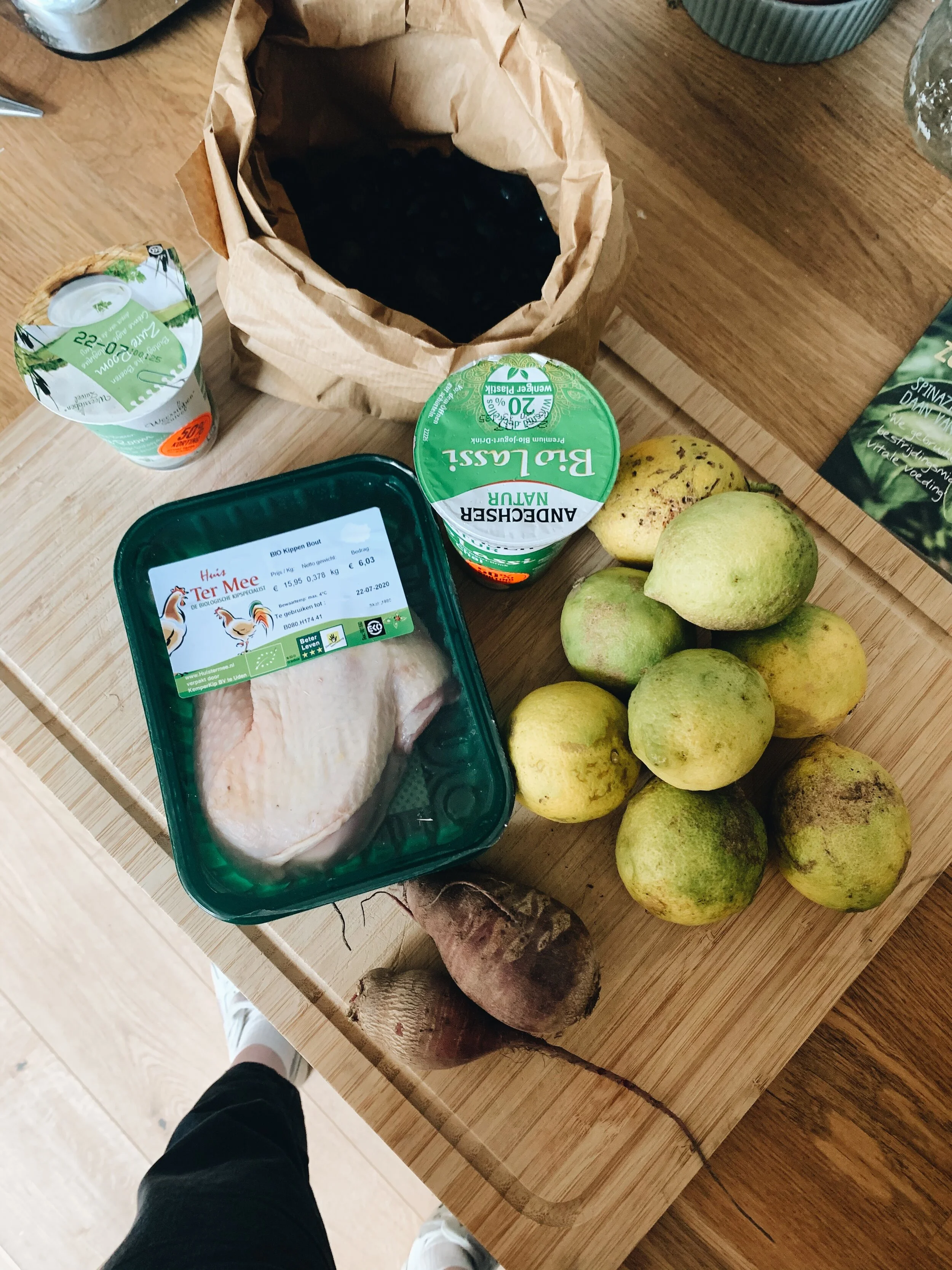 Ook probeerde ik voor het eerst een magic box van Too Good To Go uit. Via de app kan je eten of boodschappen bestellen voor een klein prijsje. De producten die je krijgt worden anders weggegooid, dus het is een geweldige oplossing tegen voedselverspilling! Ik bestelde een box bij Ekoplaza. Je hebt van te voren geen idee wat je gaat krijgen, dus dat was nogal een verrassing... De kip hebben we meteen gebruikt voor het diner, gezien de THT-datum dezelfde dag was. Van de botjes hebben we kippenbouillon getrokken. De drinkyoghurt heb ik meteen opgedronken, de rode druiven heb ik tussendoor gesnackt. De zure room hebben we (na de THT-datum, want dat kon prima!) nog gebruikt voor nacho’s. Daan bakte uiteindelijk ook nog een citroen-meringuetaart met de citroenen! Toen ik de zak kreeg, dacht ik wel eventjes "oei, wat ga ik hiermee doen", maar er kwamen gelukkig al snel ideeën. Het is echt leuk voor mensen die graag koken en wel van een uitdaging houden!