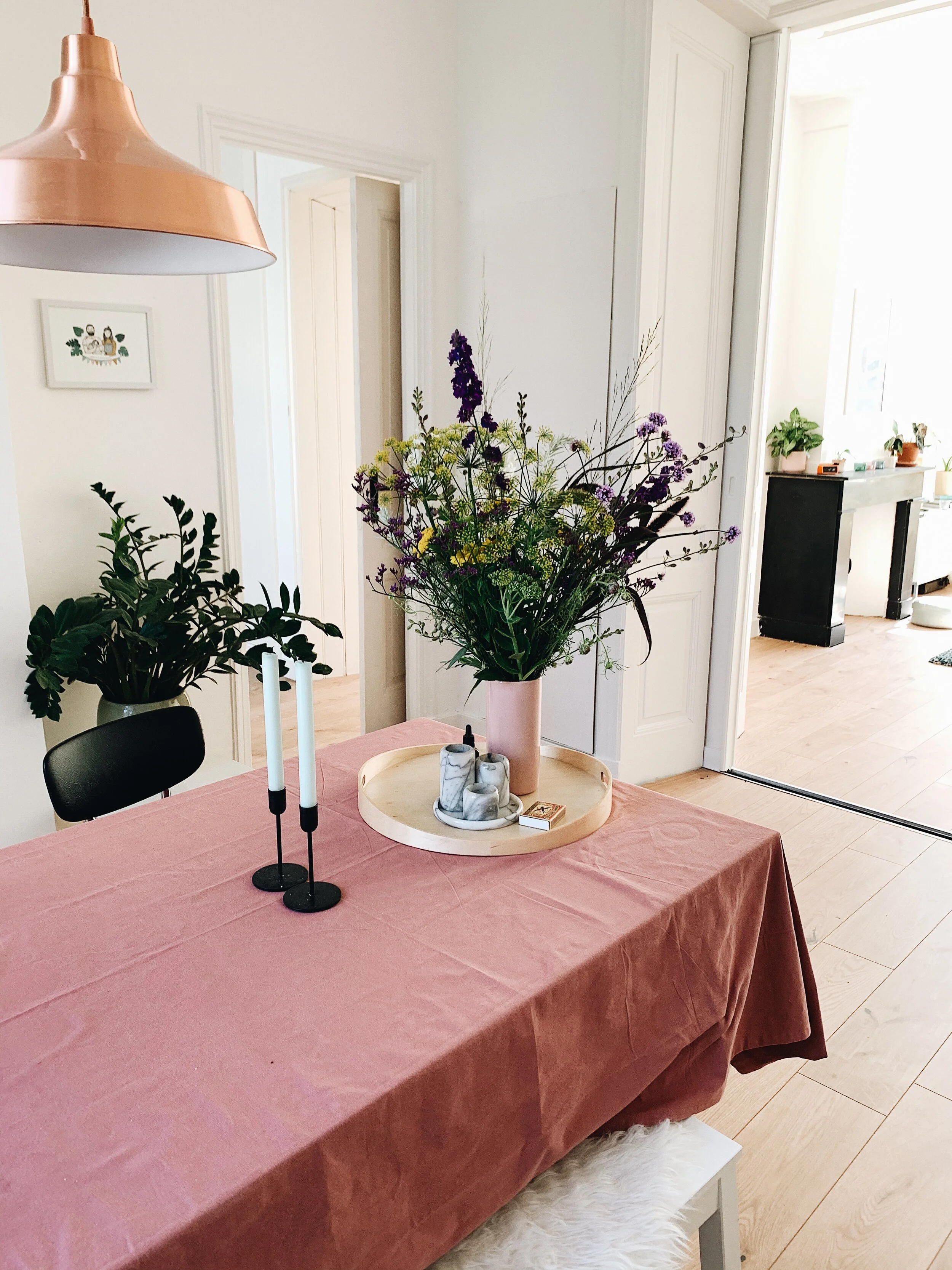 Om wat bloemen in ons eigen huis te halen, haalden we bij één van mijn favoriete winkeltjes in Den Haag genaamd Kikubari een mooi bosje. Ze werken daar wekelijks samen met een designer die de boeketten samenstelt. Ik wilde eigenlijk bestellen voor de week erna, maar toen bleek dat de designer op vakantie zou zijn. Ik mocht daarom last minute dit prachtige boeket nog halen, de laatste die er nog was! Mocht je een keer in Den Haag zijn, ga hier dan zeker langs. Het is zo’n fijn winkeltje met hele lieve mensen.
