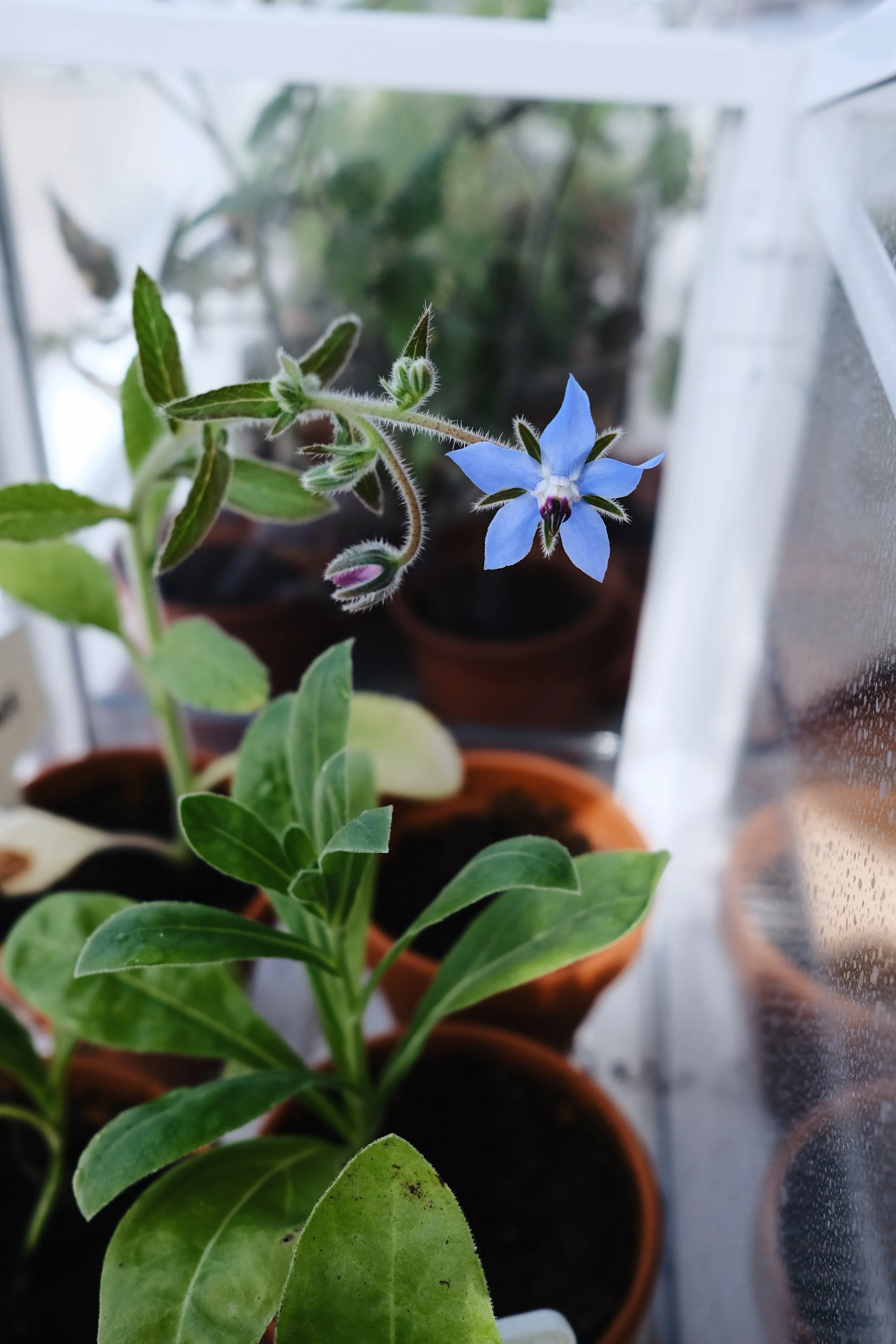 Nog een bloem kwam uit in de kas op de vensterbank, dit keer was het een prachtige paars-blauwe bloem van komkommerkruid (borage). Ik vind dat zulke mooie bloemen, hoewel ze wel een beetje “prikken”. Deze bloemetjes zijn met mate eetbaar, en smaken een beetje naar komkommer. Lekker fris!