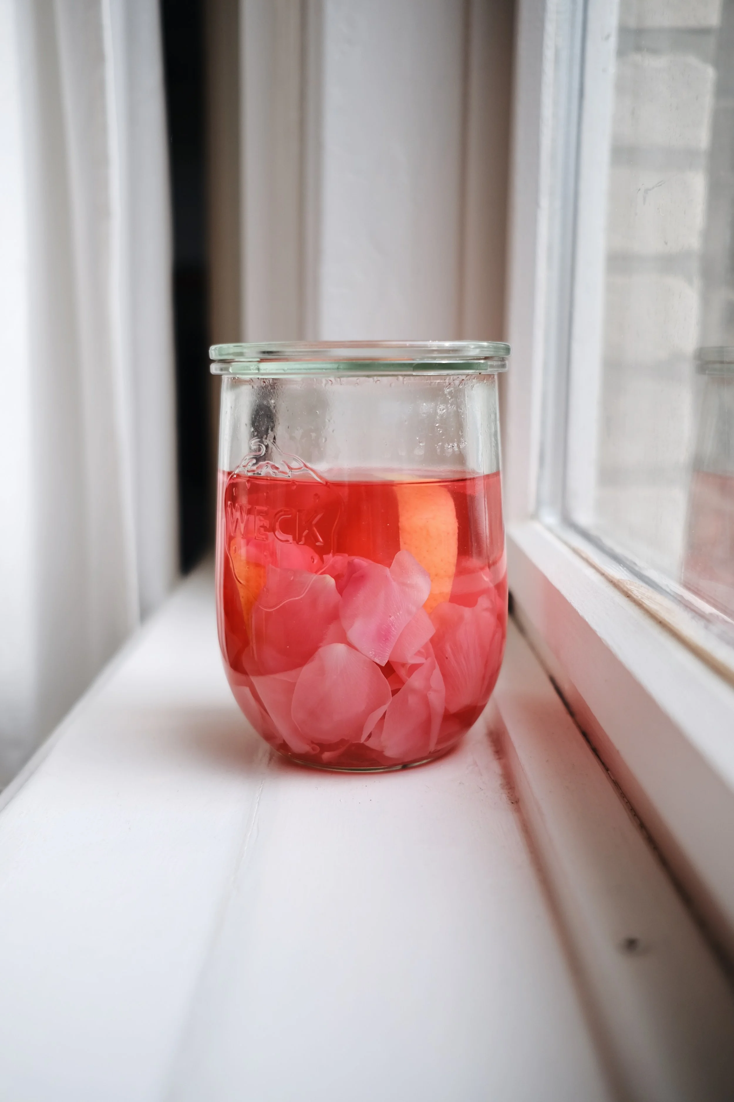 Toen we vertrokken – onderweg naar onze fietsen – kwamen we langs het schelpenpad door de duinen een prachtige zee van rozenbottelsstruiken tegen. De geur was echt betoverend, dus ik besloot ter plekke om wat bloemblaadjes mee te nemen, zodat ik deze kon omtoveren tot een heerlijke limonade.