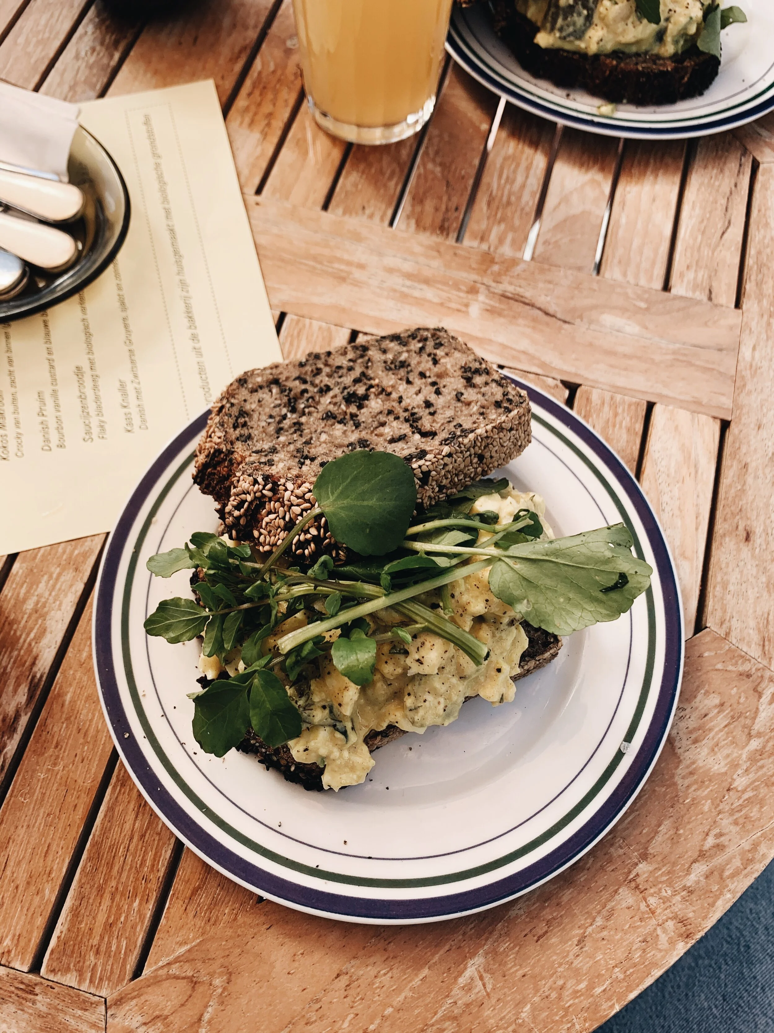 We bestelden allebei een limonade. Ik ging voor de meloenlimonade (aanrader!) en Daan ging voor de manderijnlimonade (ook een aanrader!). Heel verfrissend, het viel me op dat het niet extreem zoet was. Als lunch kozen we beiden voor het zuurdesembrood met eiersalade. Het was echt zo’n grove eiersalade, daar moet je van houden! Voor mij waren het iets te grove stukken ui en augurk, maar dat was makkelijker eruit te halen als het teveel werd. Het brood was echt ongelofelijk lekker en niet al te zwaar. De menukaart is niet super uitgebreid, maar wel lekker recht-toe-recht-aan.